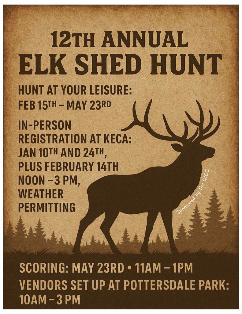 The 12th Annual Elk Antler Shed Hunt Scoring Event is scheduled for 2026. Registrations will be accepted by mail until February 14, 2026. Members of the QIDC will be doing in person registration on January 10 and 24, as well as February 14 at the Elk’s Visitors Center from 12pm to 3pm. The participation fee is $10 per person. Scoring will take place on May 23, 2026 from 11am to 1pm at New Pottersdale Park (see map). There will be other vendors present as well!