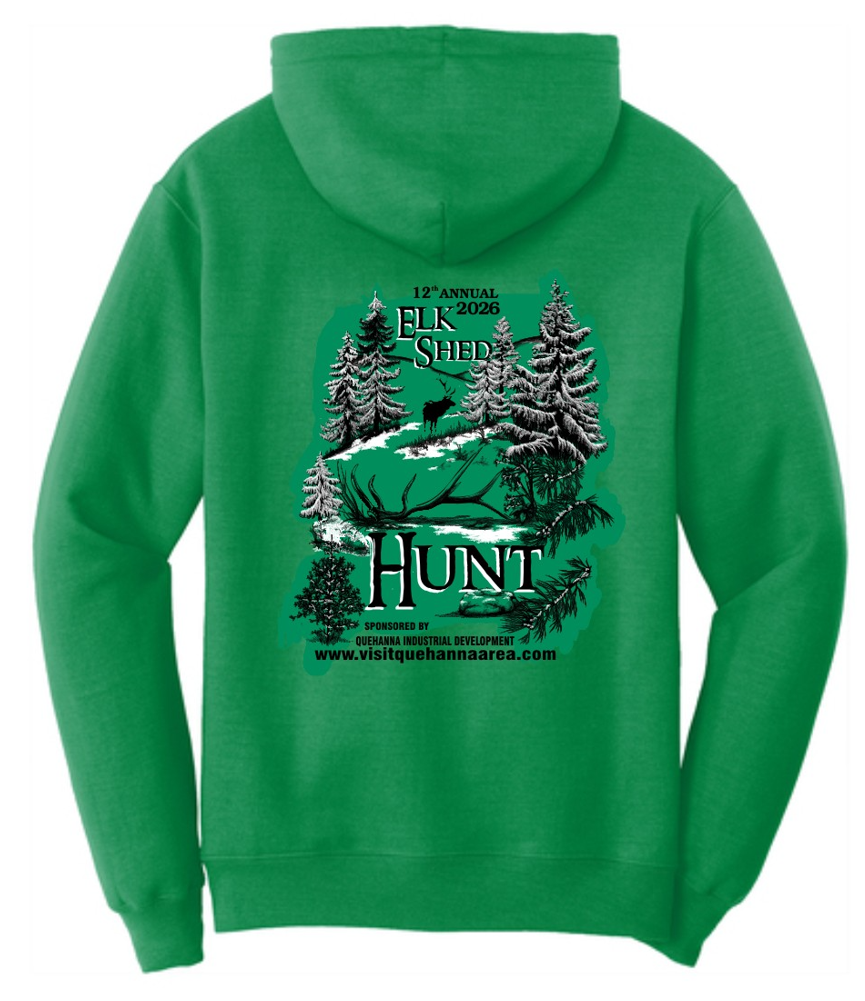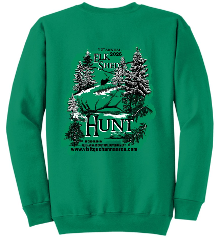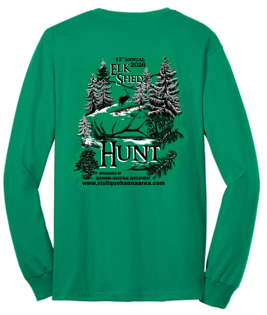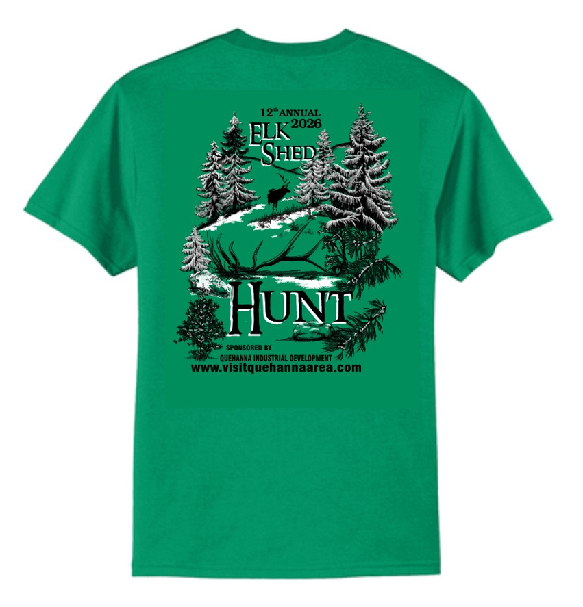 The 2026 Elk Shed Apparel range in sizes Small to 4 XLarge. They are only available in Green. T-shirts, Long sleeve and short, Hoodies, and Crewneck.